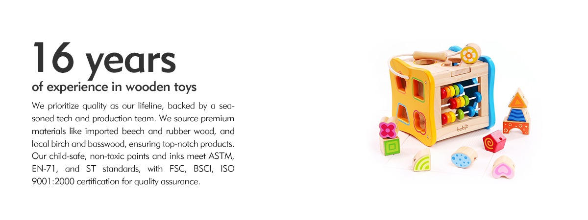 Boby is a company specializing in the design and production of wooden toys, with a core focus on children’s early educational and intellectual development. With 16 years of expertise in export toy manufacturing, our products comply with internationally recognized toy quality standards, including EU EN71, US ASTM, Japan ST, and Australia ISO8124. We maintain long-standing collaborations with global toy brands, delivering premium OEM and ODM services. Our products are distributed to markets across the United States, Europe, Southeast Asia, and other regions. Additionally, we are proud to be a member of the China Toy Association.
